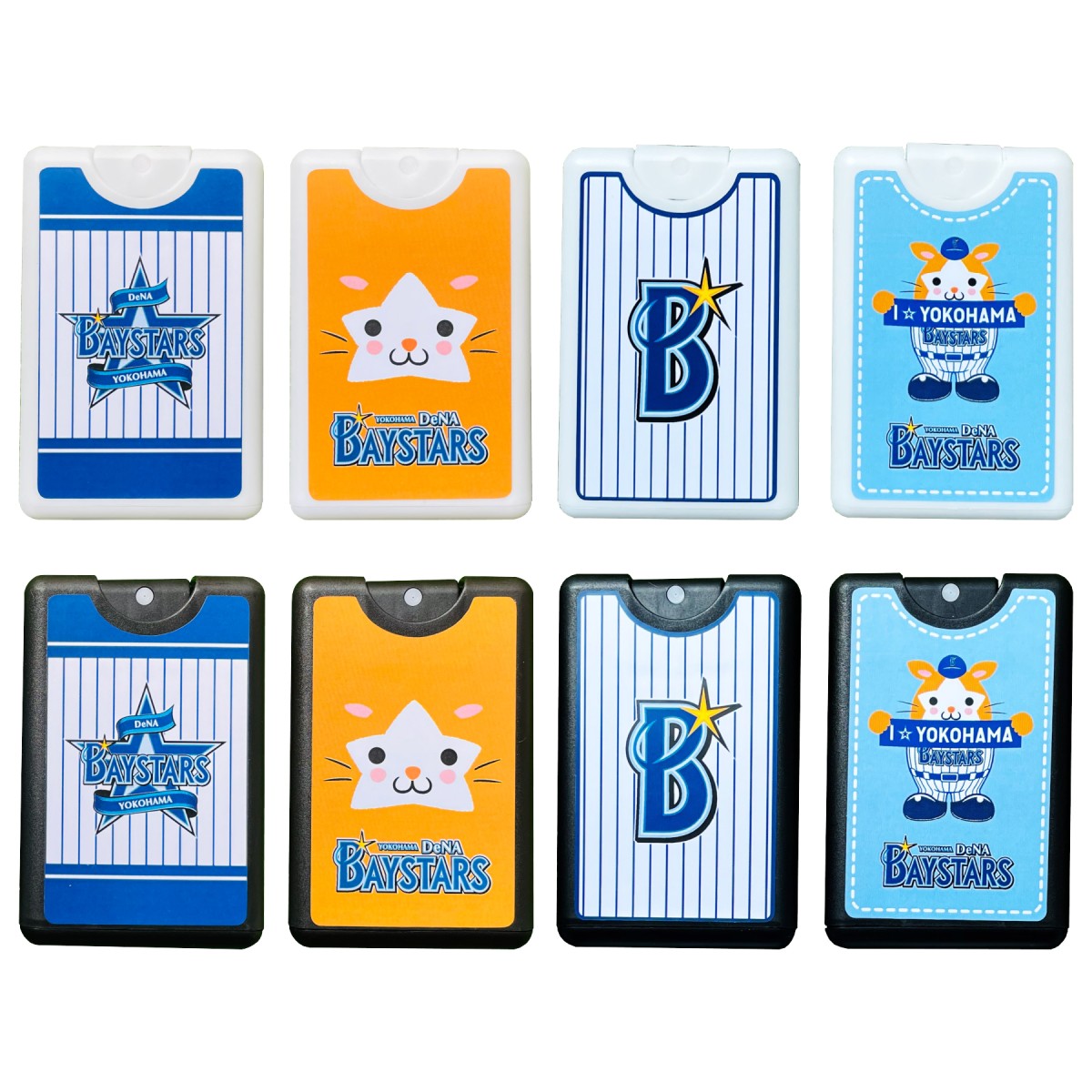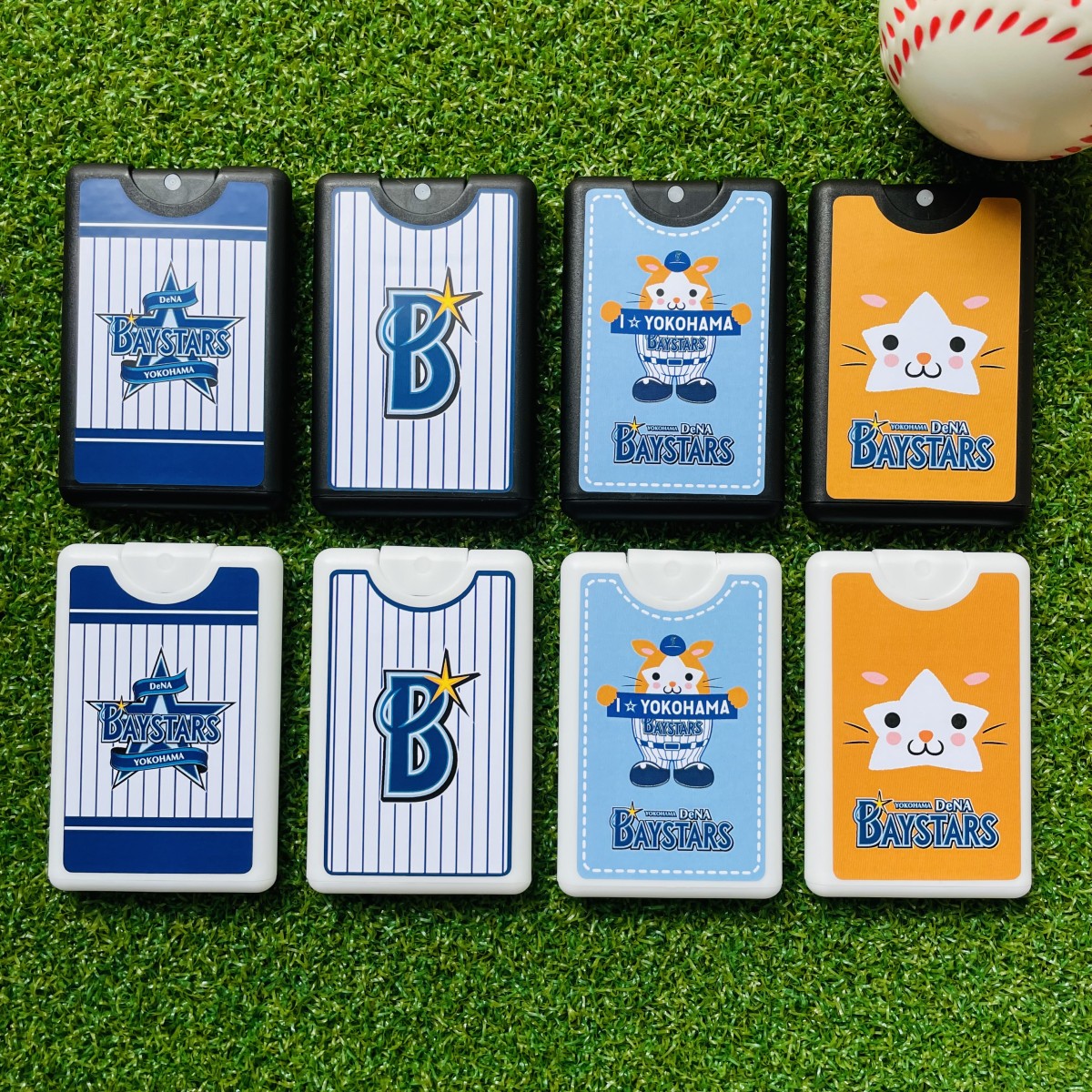 横浜DeNAベイスターズのロゴなどを使用した除菌スプレーのラインナップは全部で8種類。